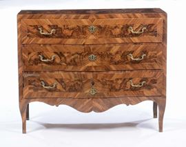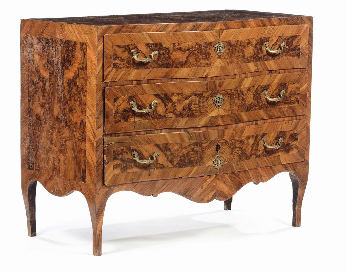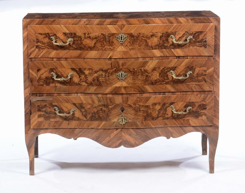 Comò a tre cassetti lastronato in noce e radica di noce, XVIII secolo