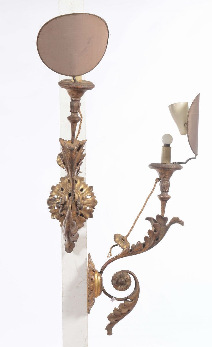 Coppia di appliques in legno intagliato e dorato, XVIII secolo