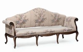 braccioli a ricciolo con intaglio vegetale, schienale sagomato, gambe arcuate, cm 210x86x110