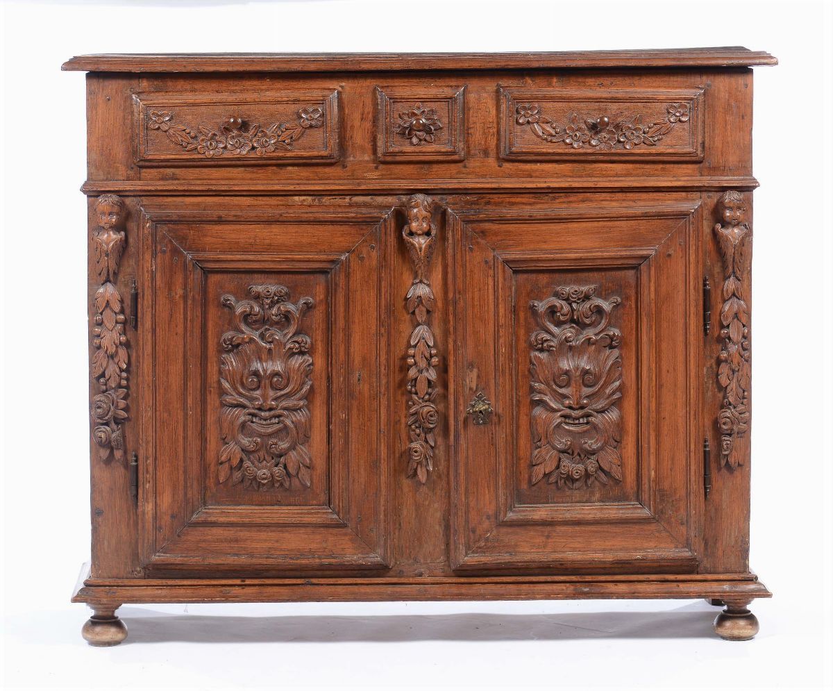 montanti con decori di testine di putti da cui si dipartono cascate vegetali e floreali, base a due ante pannellate intagliate a mascheroni, tre cassetti sulla sommità, cm 139x46x118