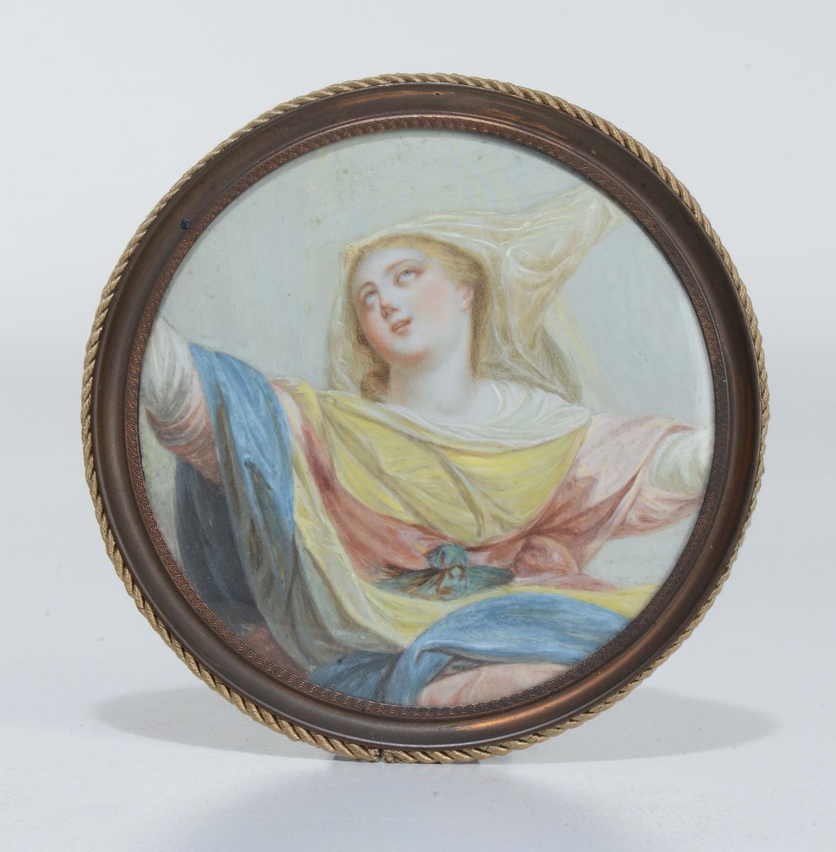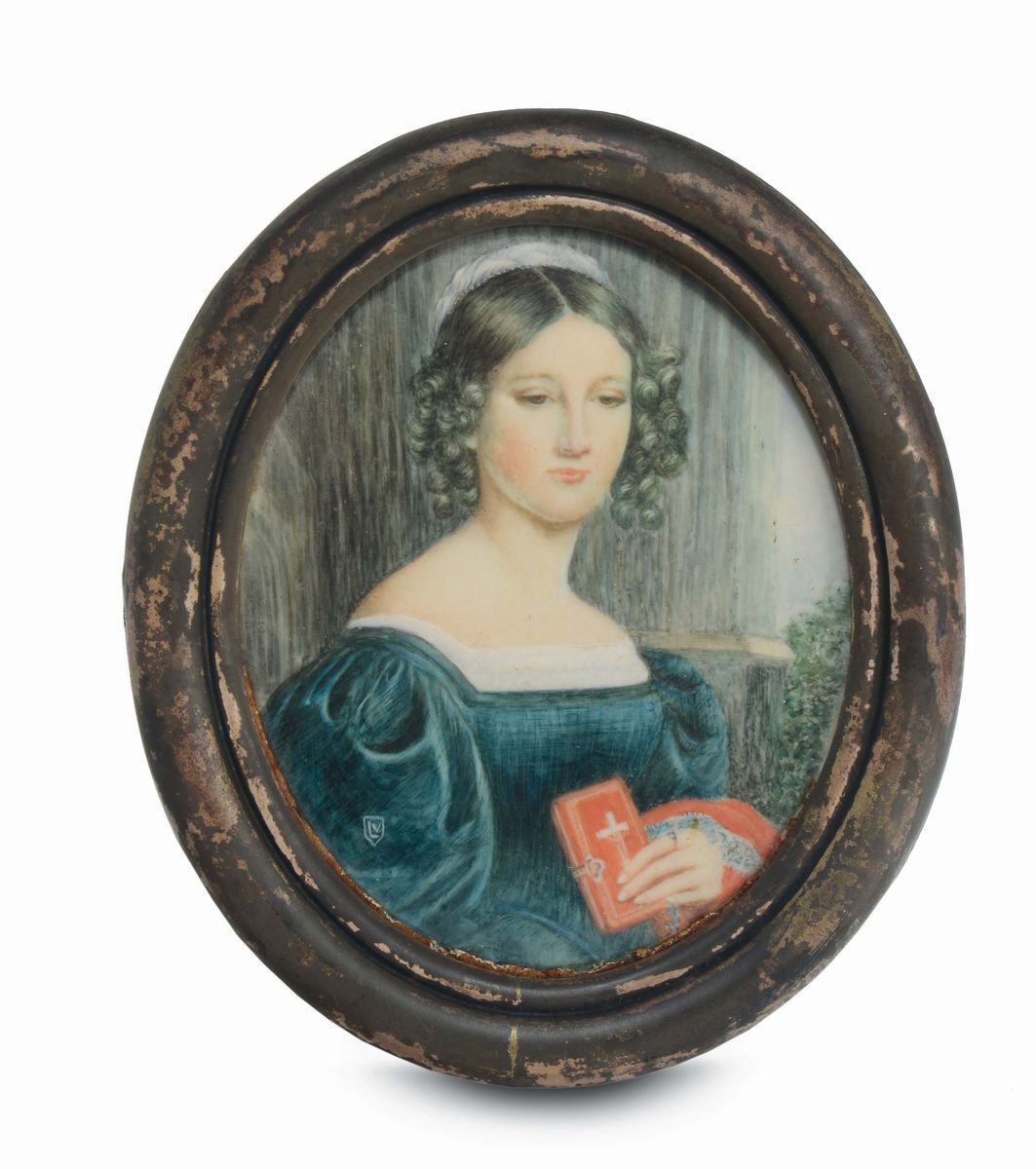 Due miniature raffiguranti estasi di Santa e donna con libro siglata LV, XIX secolo