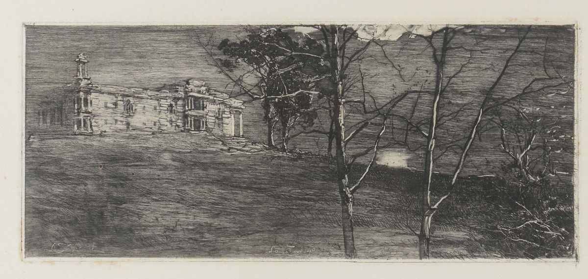 Incisione raffigurante paesaggio, da dipinto di Conconi