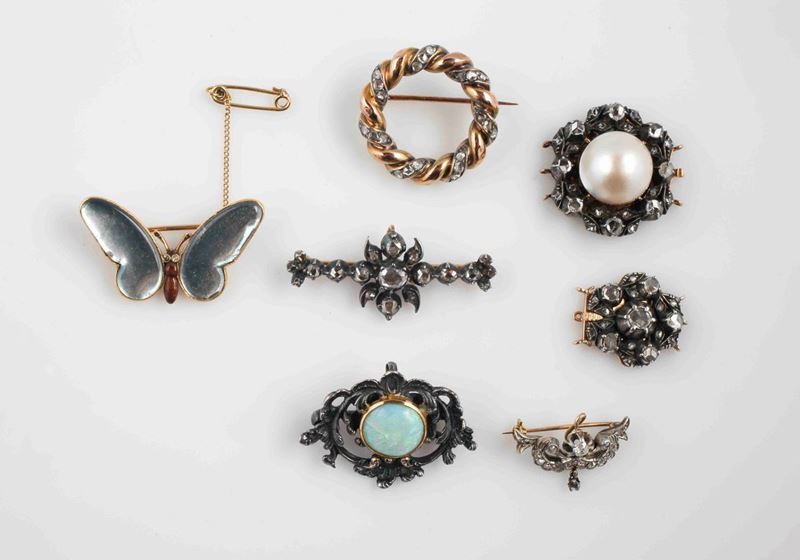 Lot composed by five gold,silver, gem-set and paste brooches and two clasps