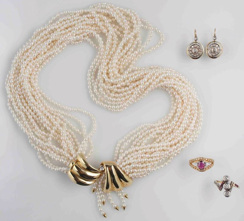 Lot composed by two rings, a multi-strand pearl necklace and a pair of earrings