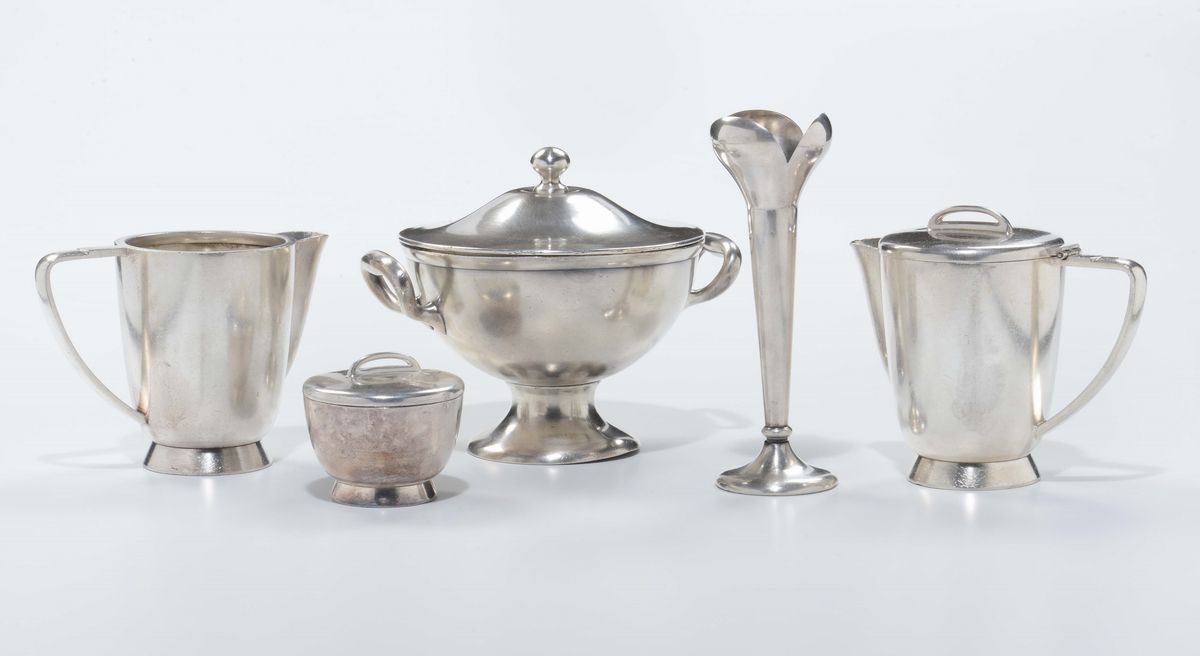 Caffettiera, lattiera, zuccheriera e vasetto soliflore in alpacca argentata prodotti dall'Argenteria Calderoni nel 1964 su disegno di Gio Ponti degli anni '30; zuccheriera prodotta dalla ditta Krupp Berndorf. Altezze cm 12, cm 11,5, cm 6, cm 19, cm 17.