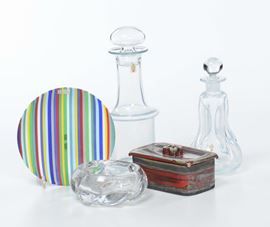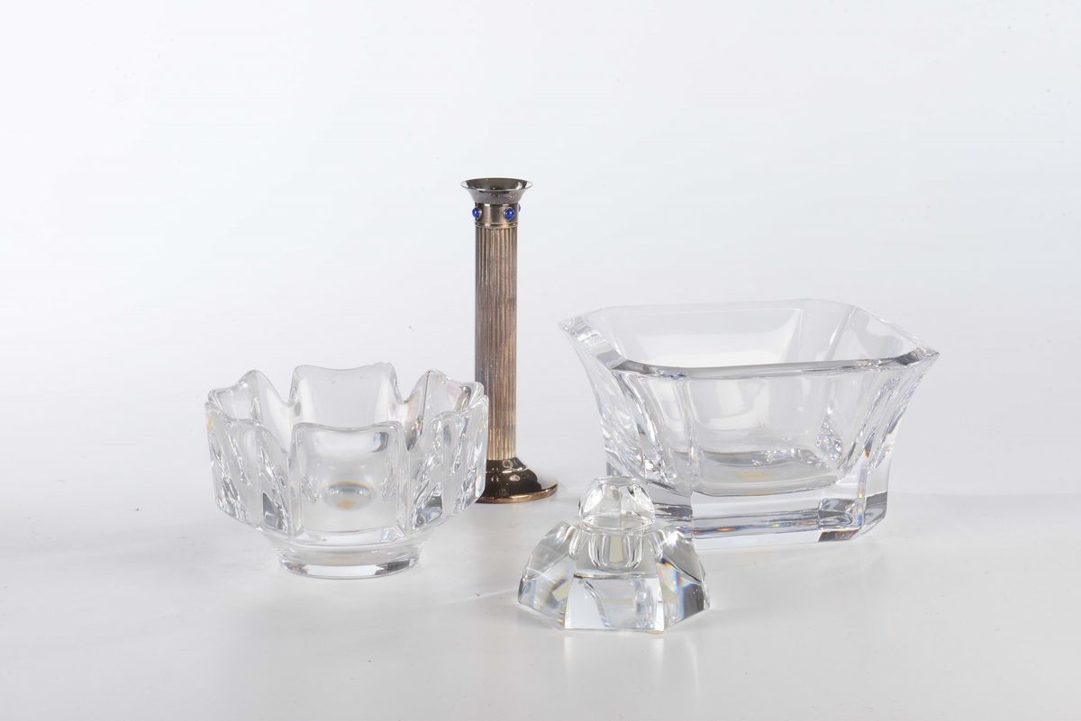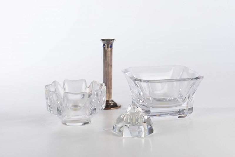 composto da due vasi e posacenere Orefort, calamaio Baccarat, vasetto Cartier, due bottiglie HolmeGaard