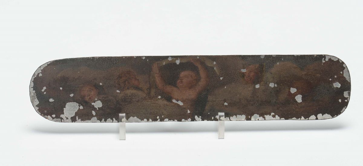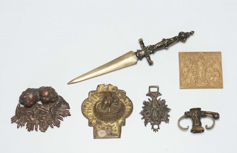 Impugnatura per stiletto in metallo dorato cm 4x7, Tagliacarte in ottone cm 24, Due angioletti in rame sbalzato, cm 10x8, Piastrina in metallo dorato con Cristo (per Concilio Ecum. Vat. II). Cm 6,8x7,5, Piastrina metallica con putti. Cm 24.5x5,5, Pendaglio con Santo, sec XVIII. Cm 8,5 h