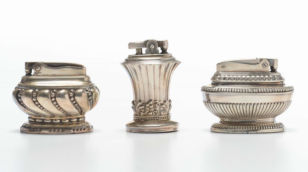 Lotto di tre accendini in metallo argentato