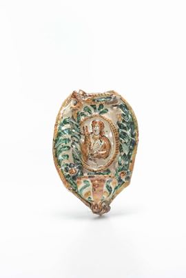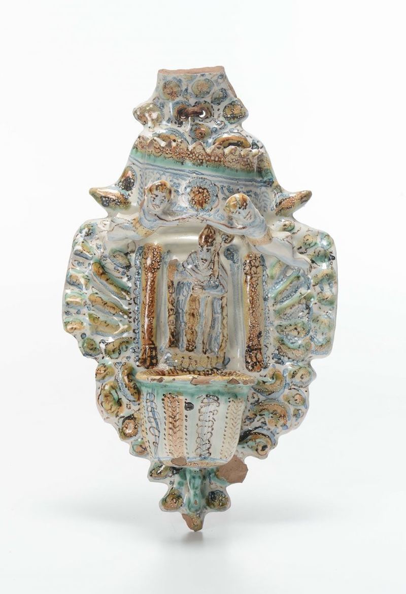 Lotto di tre acquasantiere in maiolica policroma, XIX secolo