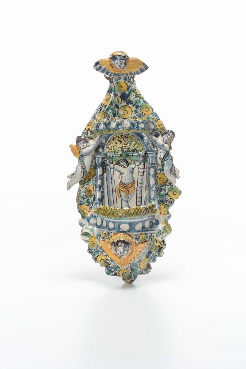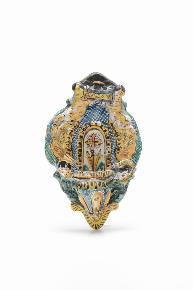 Lotto di tre acquasantiere in maiolica policroma tipo Castelli, XIX-XX secolo