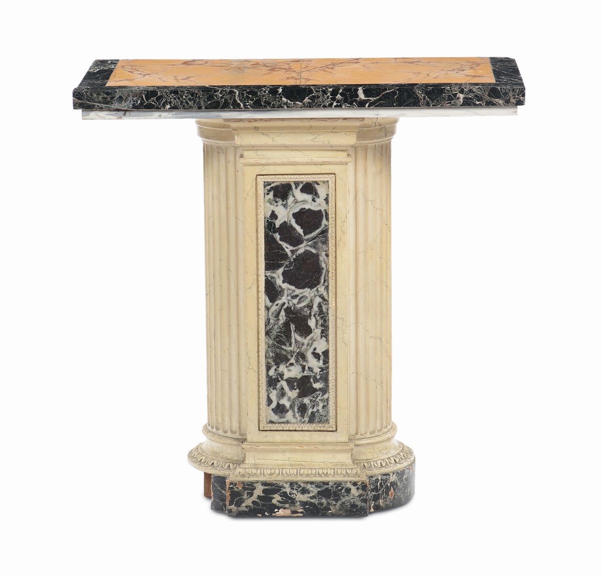 base in legno laccato e scanalato e fronte decorato con marmo incassato, cm 102x50x103