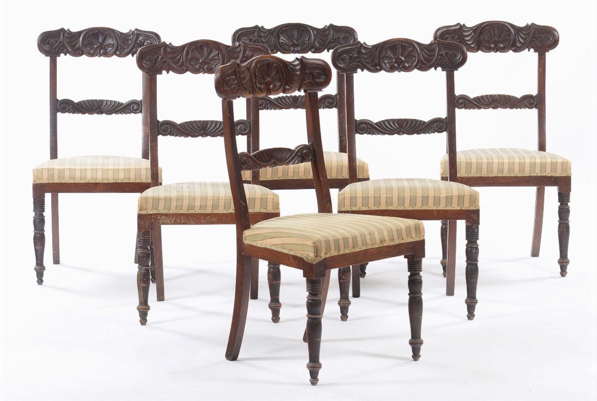 Sei sedie con schienale intagliato, XIX secolo