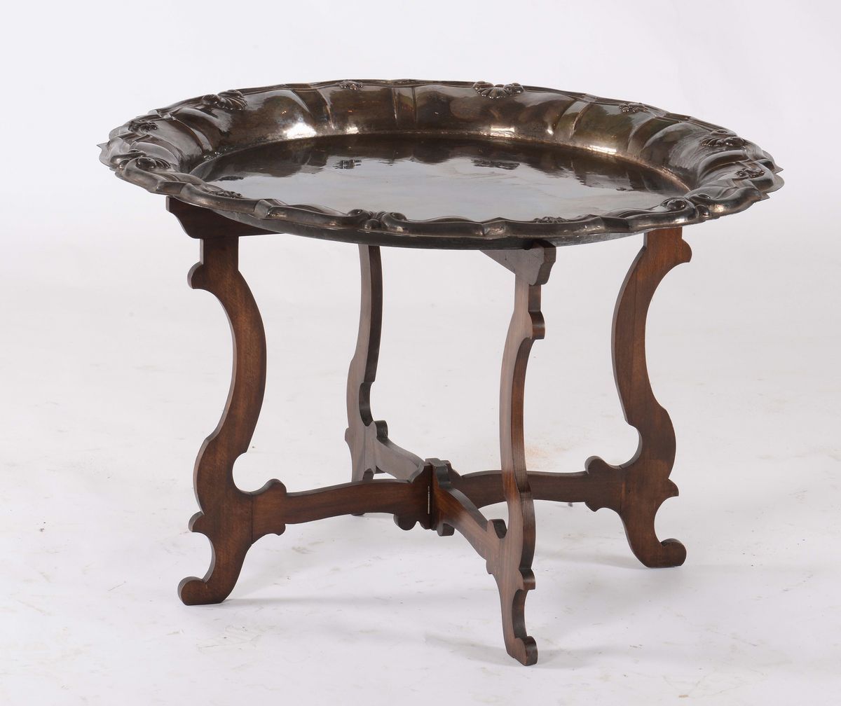 Vassoio in metallo argentato con base in legno, XX secolo