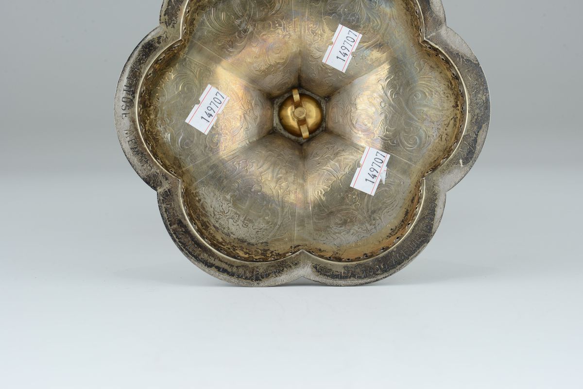 base polilobata con incisioni a bulino raffiguranti Santi e crocifissione.altezza cm 22, gr. 635