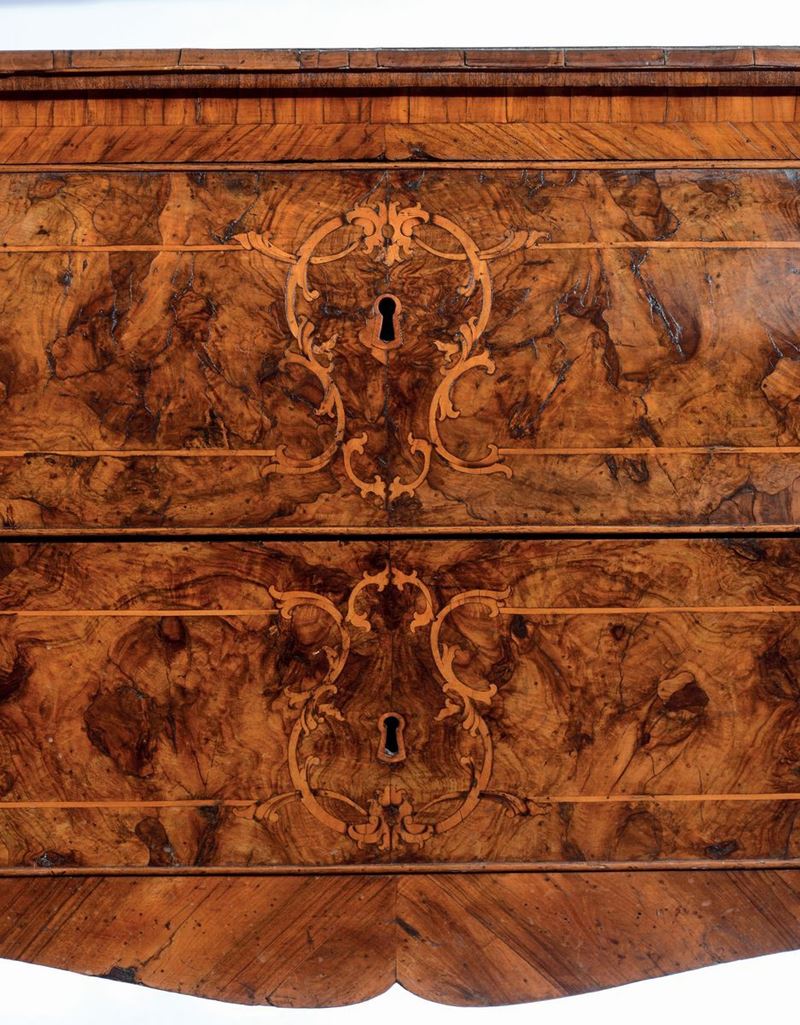 Commode Luigi XV interamente intarsiata in noce, radica di noce e bosso, Milano, 1770 circa