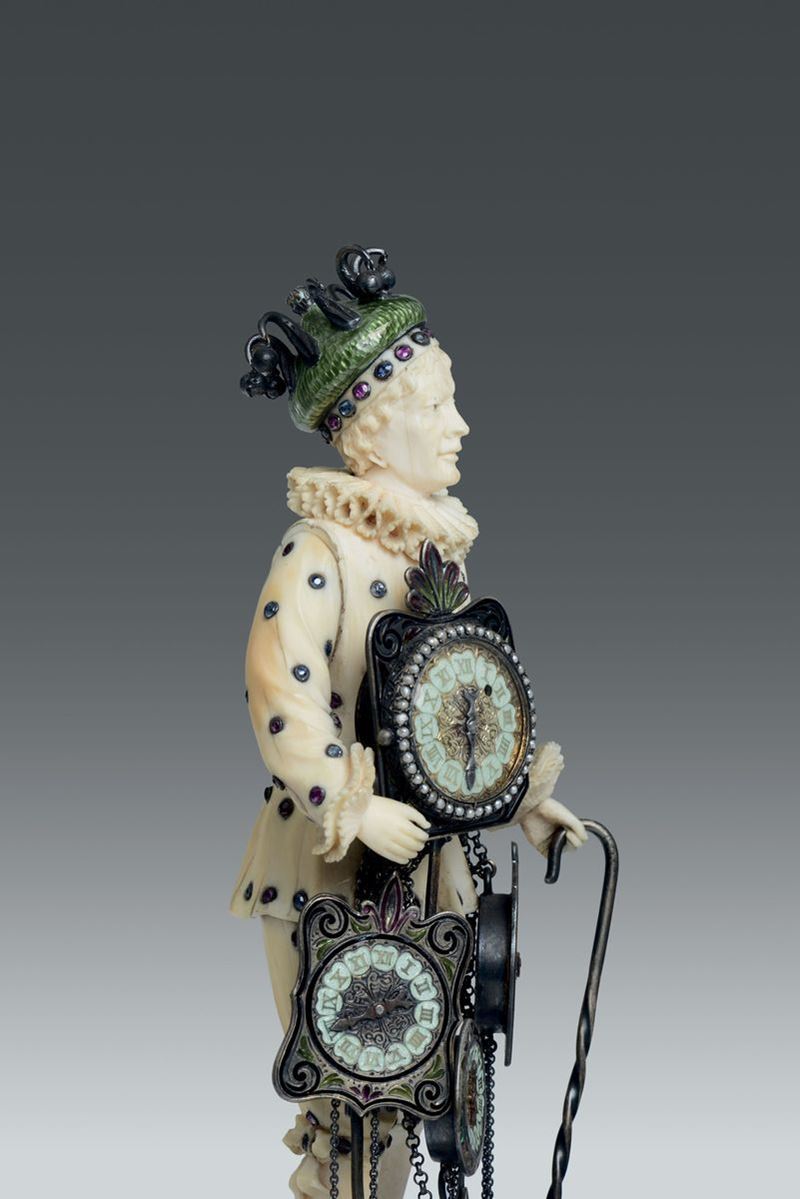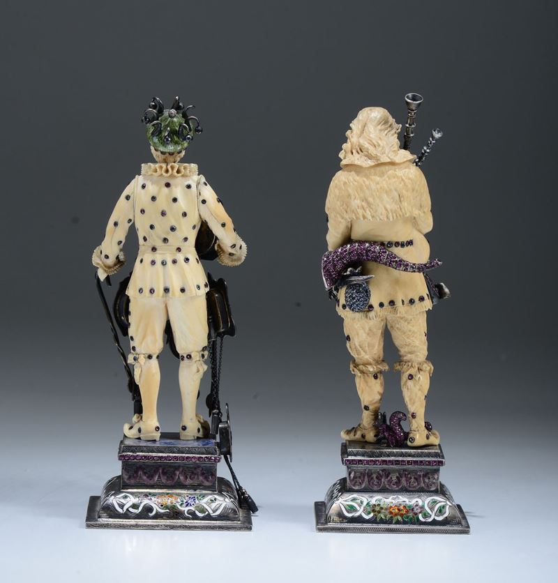 Una raffigurante suonatore di cornamusa con finimenti in argento e borsa tempestata di ametiste, la seconda raffigurante giullare con copricapo a sonagli nell’atto di trasportare numerosi orologi. Entrambi, raffigurati in abiti seicenteschi, poggianti su basi a plinto gradinato in argento, smalti e ametiste.Altezza cm 23