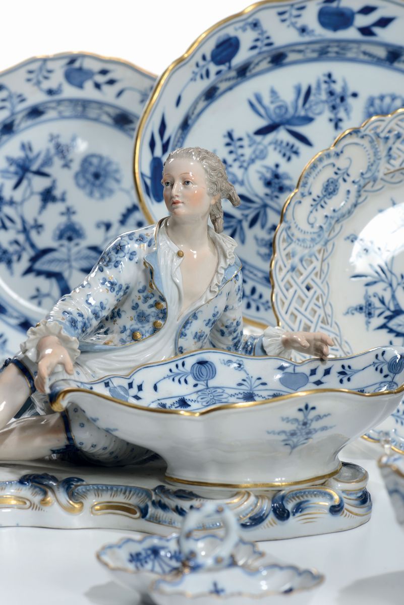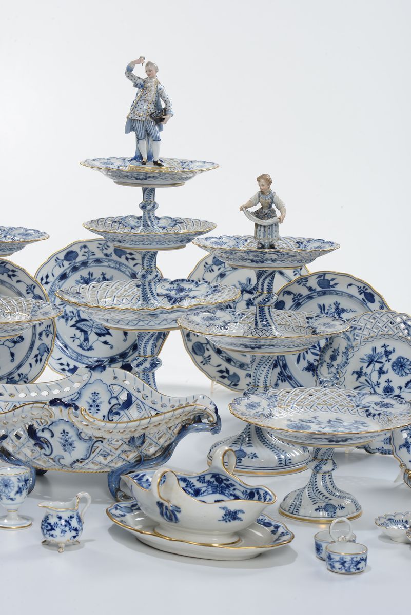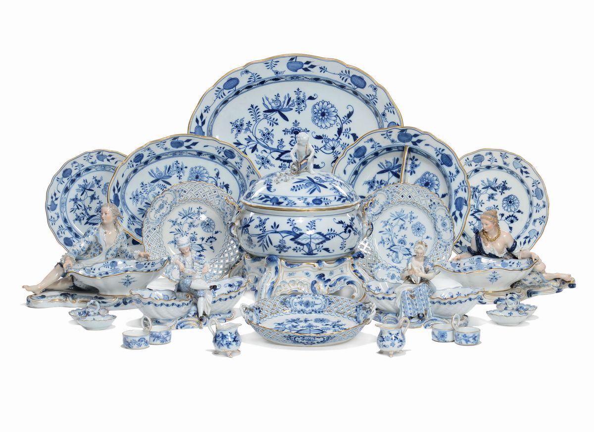 Importante e ricco servizio da tavola in porcellana di Meissen a decoro Cipolla in blu cobalto, XIX-XX secolo