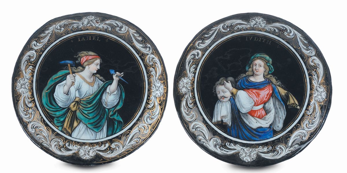 coppia di piattini in rame e smalti policromi con ritratti femminili biblici, Limoges XVII secolo, diametro cm 12,5