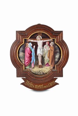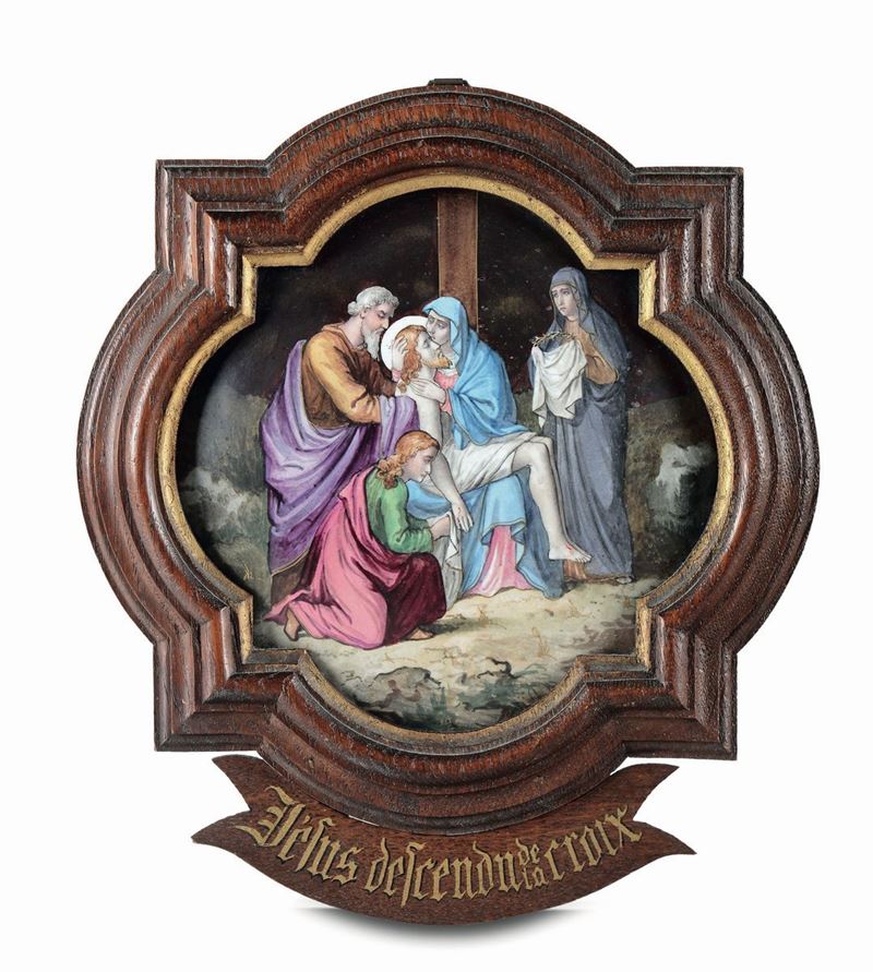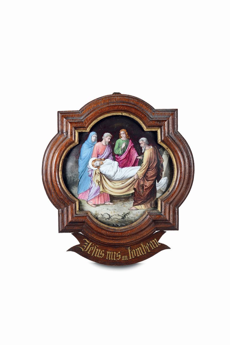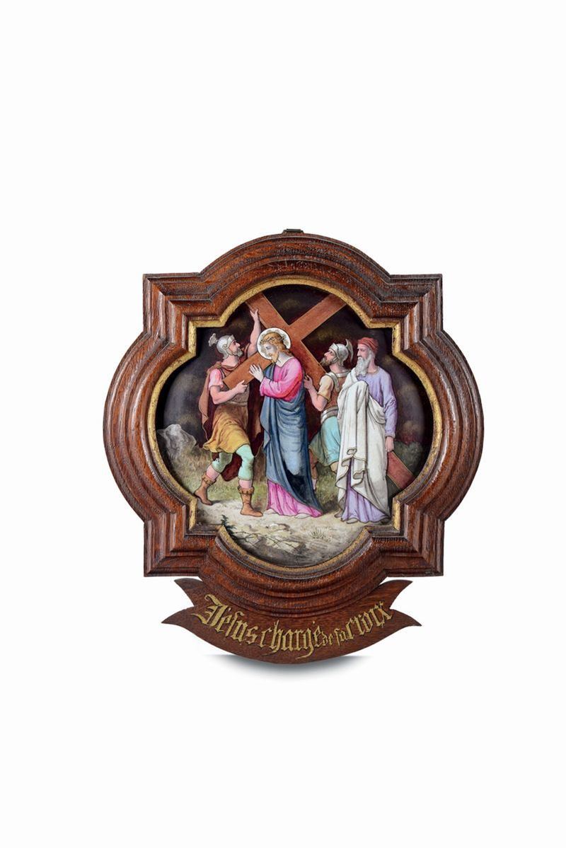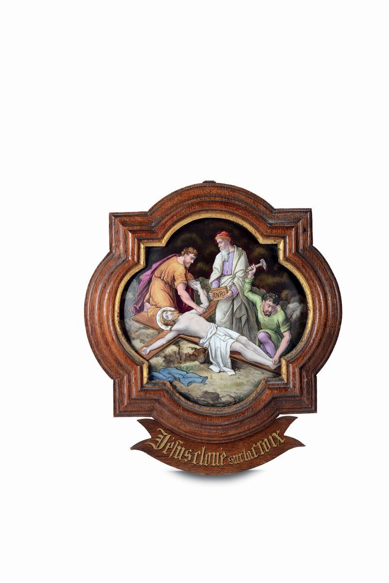 quattordici placche in porcellana smaltata di forma quadrilobata, cm 19,5x9,5 entro cornici legno e oro con cartigliuna placca reca la firma: L. Chovet a Paris propriétécm 19,5x9,5