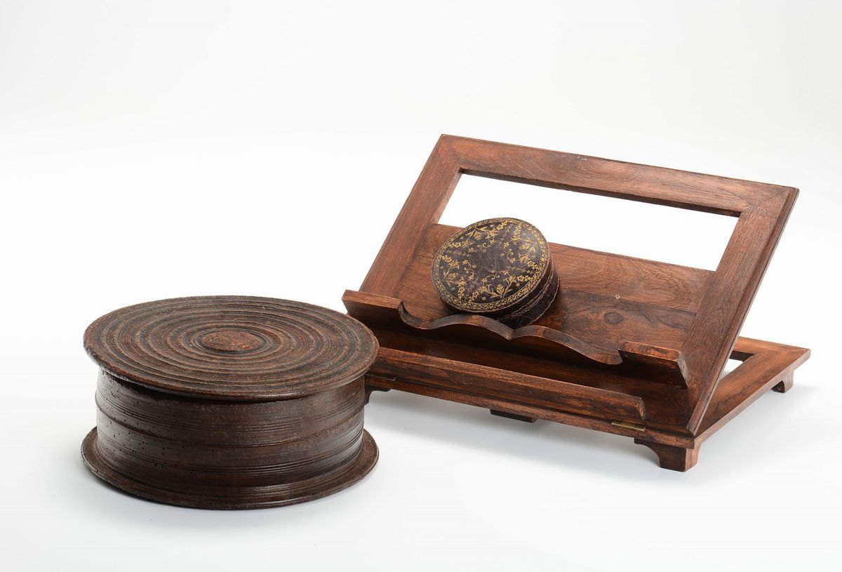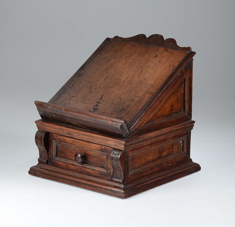 poggialibro con cimasa sagomata, parte sottostante a plinto incorniciato con tiretto centrale e mensole intagliate a medaglione.Nel lotto altro leggio e due scatole di cui una in legno ed una in cuoio