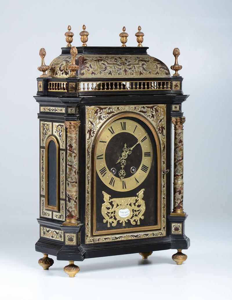 Cassa in legno ebanizzato e con decorazioni di tipo boulle, agli angoli quattro colonne con capitelli corinzi in bronzo dorato, quadrante con fascia oraria in metallo con numeri romani incisi e applicata su uno sfondo di velluto nero. Firmato su una placchetta in smalto bianco Thuret a Paris. Meccanica quadrata con scappamento ad ancora, suoneria a ore e mezze su campana.cm 56x38x17