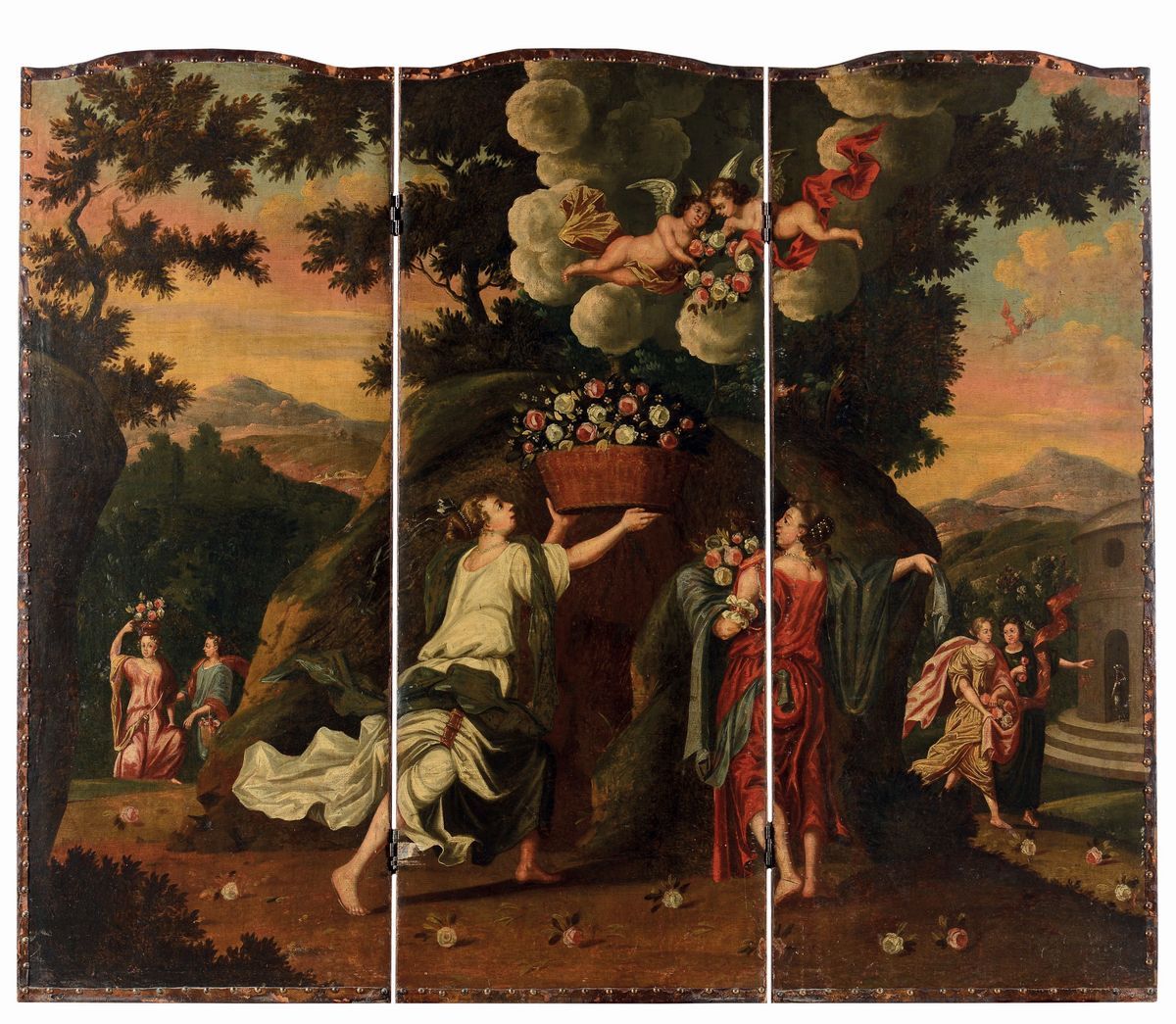 Paravento a tre ante ricavato da un dipinto ad olio su tela, cm 171x145