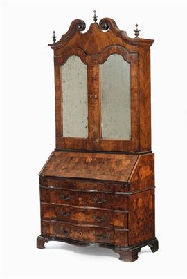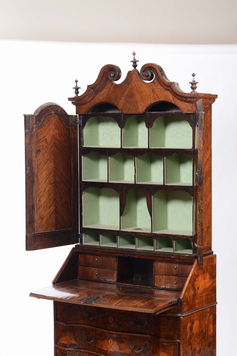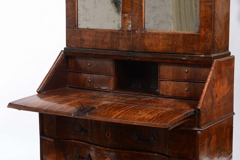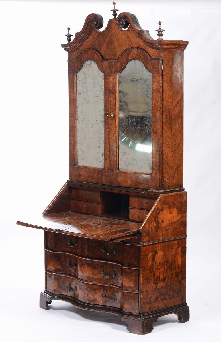 base con fronte mosso a tre cassetti, calatoia celante quattro cassettini, vani a giorno a vano segreto, alzata a due ante a specchio con vani a giorno interni, cm 119x53x260