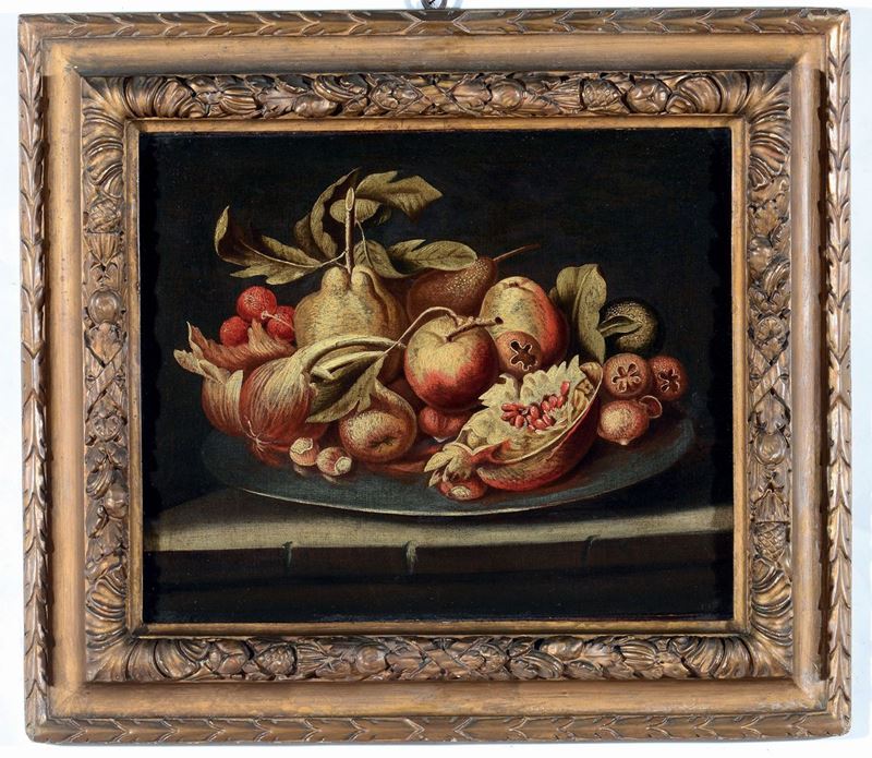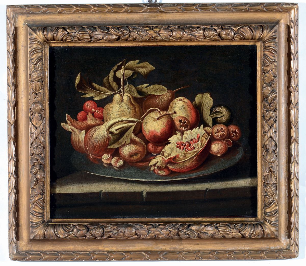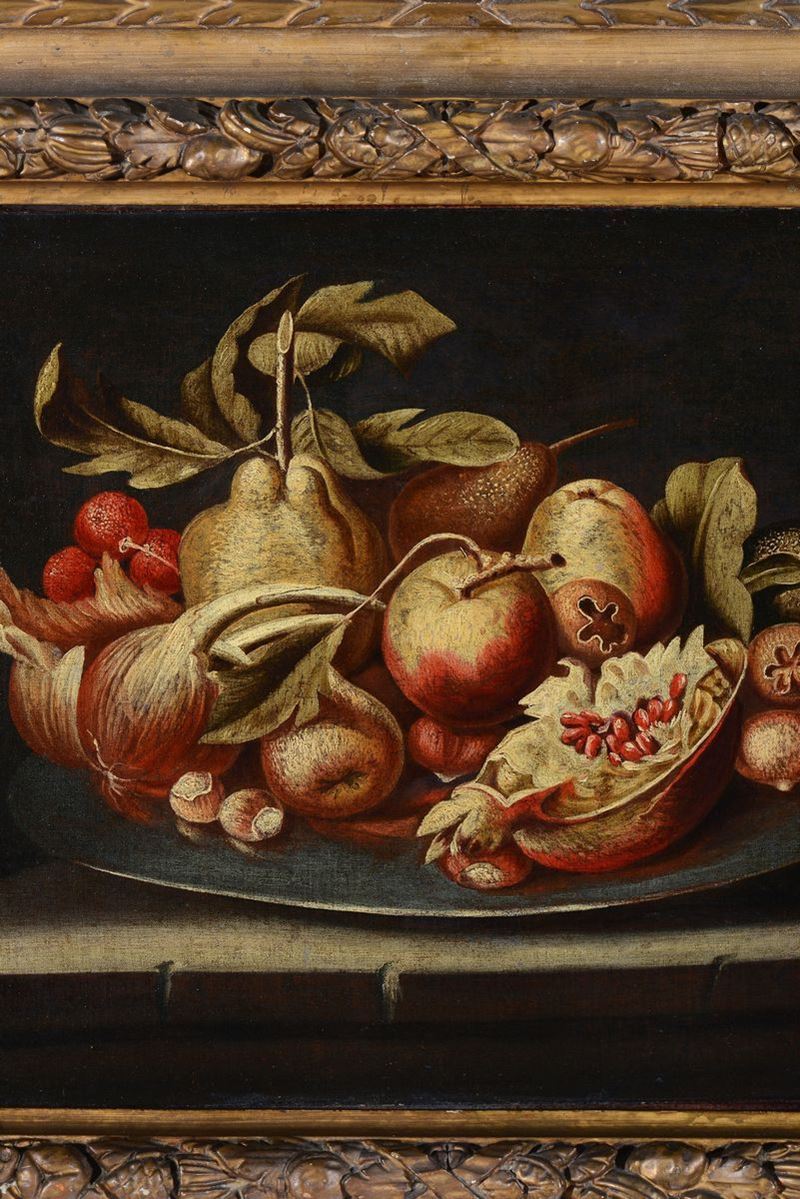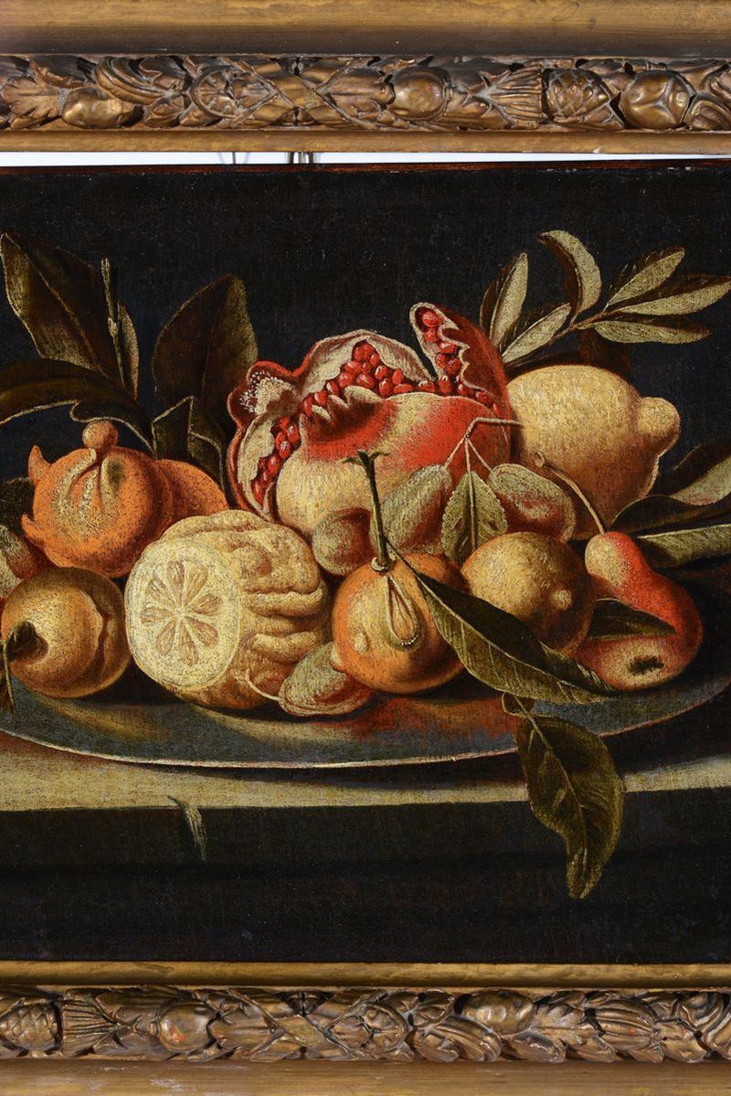 Maestro della fruttiera lombarda (XVI secolo), cerchia di Coppia di nature morte con melagrana, mele, pere, e limoni su [..]