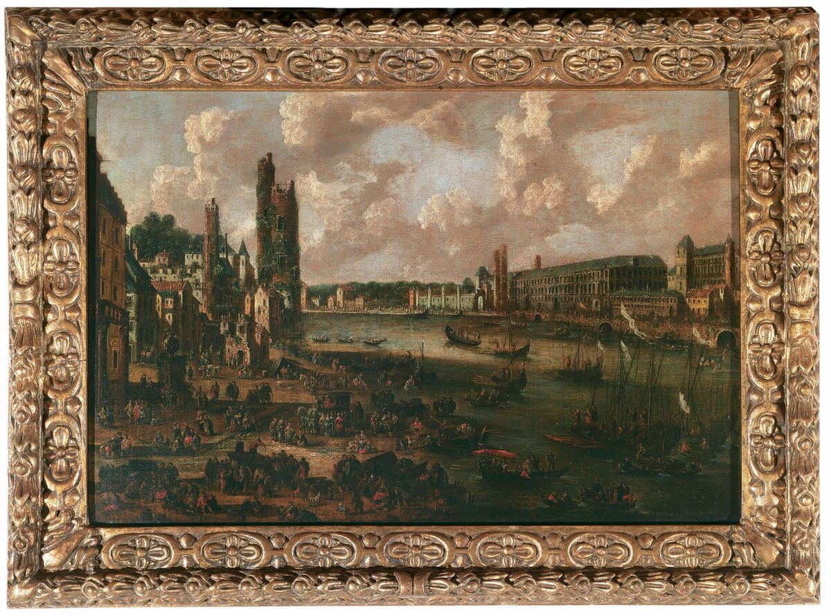 Pittore Fiammingo del XVII secolo Veduta di Parigi con la Senna e il Louvre