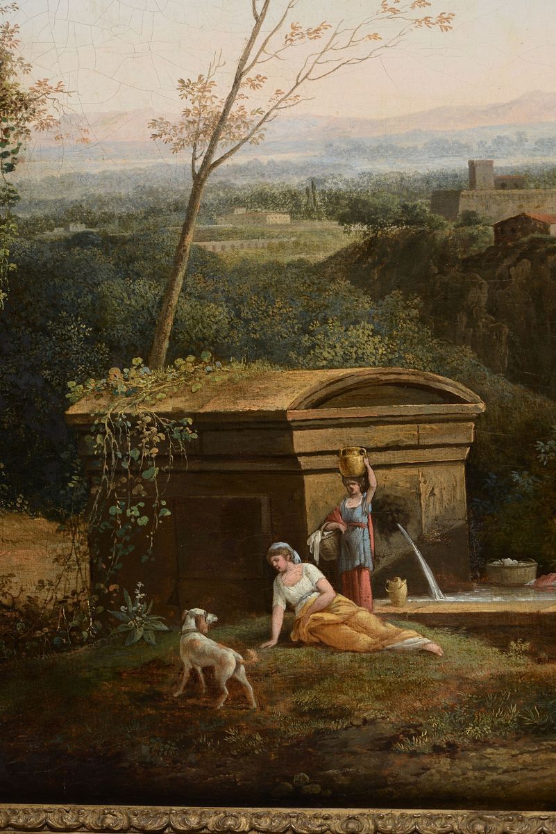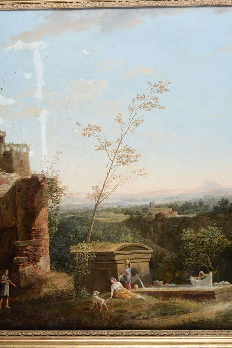 Paesaggio della campagna laziale con scorcio di borgo e figure classiche