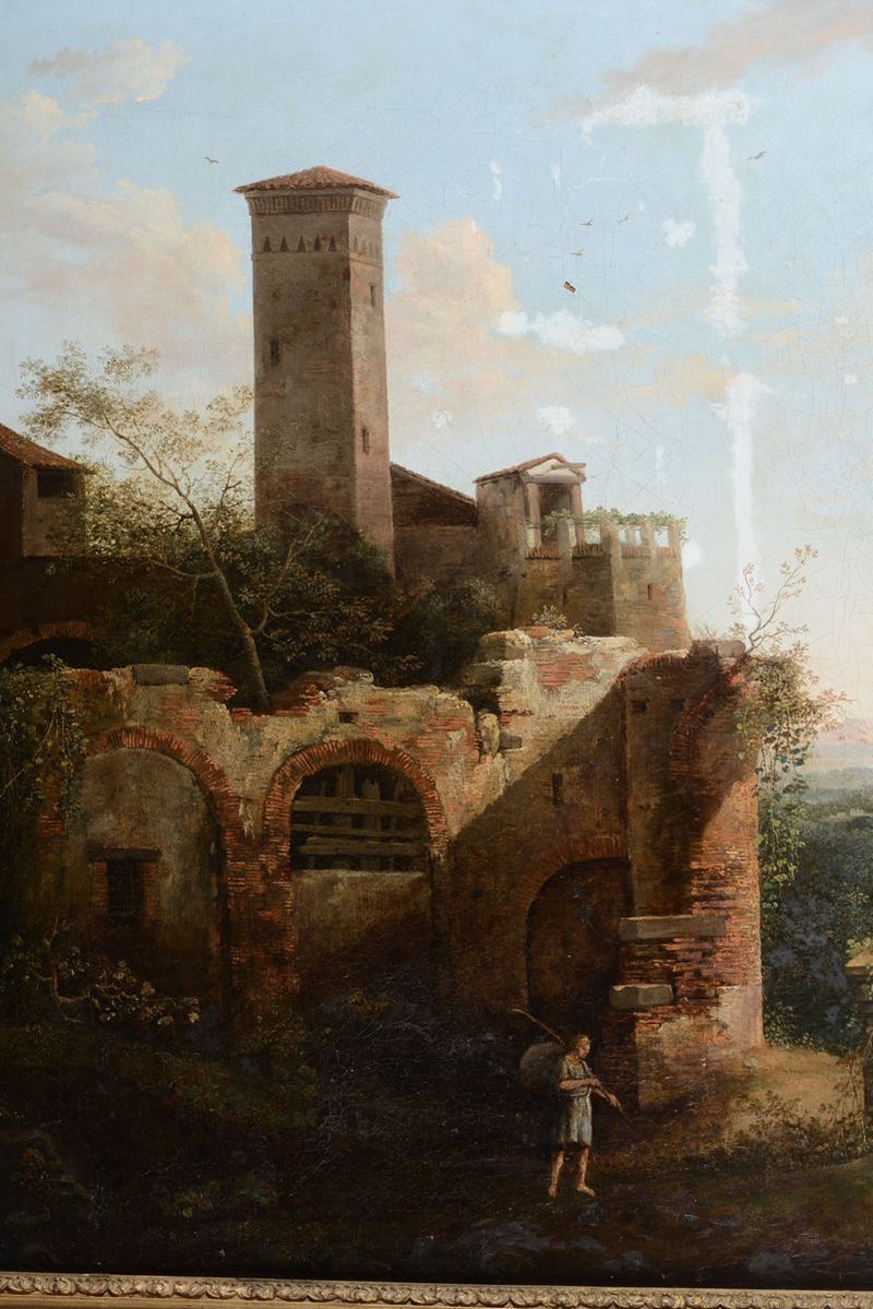 Pittore straniero attivo a Roma nella prima metà del XIX secolo Paesaggio della campagna laziale con scorcio di borgo e [..]