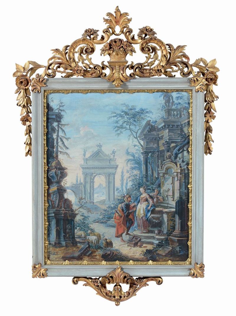 gouache su carta, cm 64x50 circa, in cornici laccate con ricche cimase intagliate e dorate