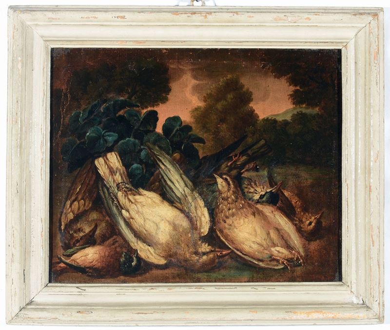 Scuola Lombarda del XVIII secolo Coppia di natura morta con pennuti