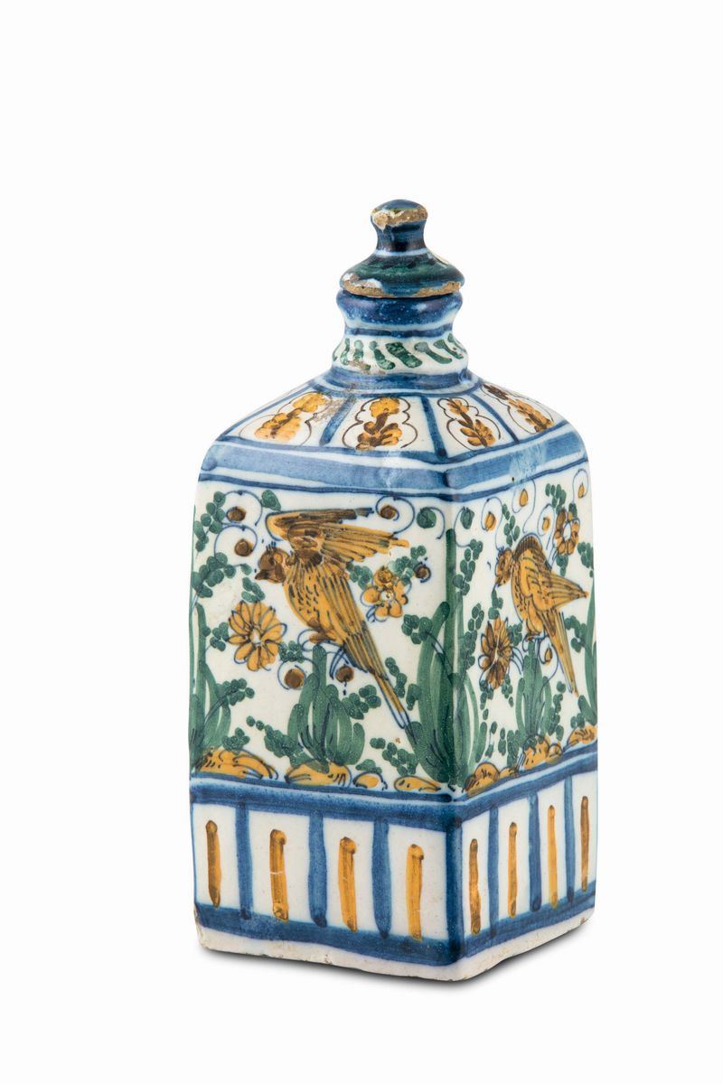 Maiolica policroma a gran fuoco, altezza cm 20,5 circaLievi usure nel tappoCorpo a sezione quadrata, piede lievemente incavato, spalla rastremata, bocca cilindrica, tappo “ a pagoda“. Nella fascia centrale il decoro “ calligrafico naturalistico “ con uccelli, tralci fioriti e fogliati su zolle terrose. La base e la spalla sono decorate “ a quartieri “ ad elementi geometrici e floreali.