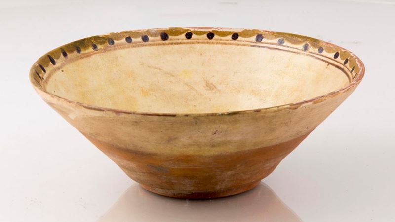 Ceramica dipinta su ingobbio, diametro cm 23,7, altezza cm 8,7Cadute di smaltoCorpo a sezione troncoconica su basso piede incavato.Decoro, al bordo, con lunette monocrome , intervallate da dischetti. Doppio filetto.