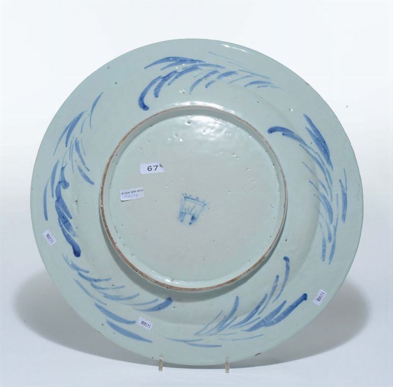 Maiolica in monocromia a gran fuoco, diametro cm 46,1Lievi sbeccature, visibiliCorpo circolare a larga tesa, base piana.Decoro “a tappezzeria“ con al centro un cavaliere portabandiera entro un paesaggio fantastico. Lungo la tesa piccoli paesaggi con rocca e torri. Al verso la marca in azzurro.