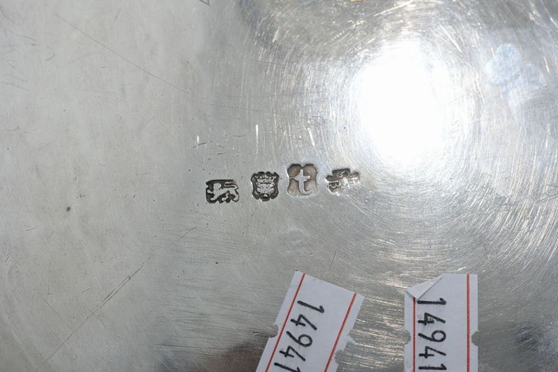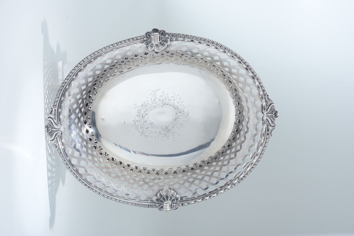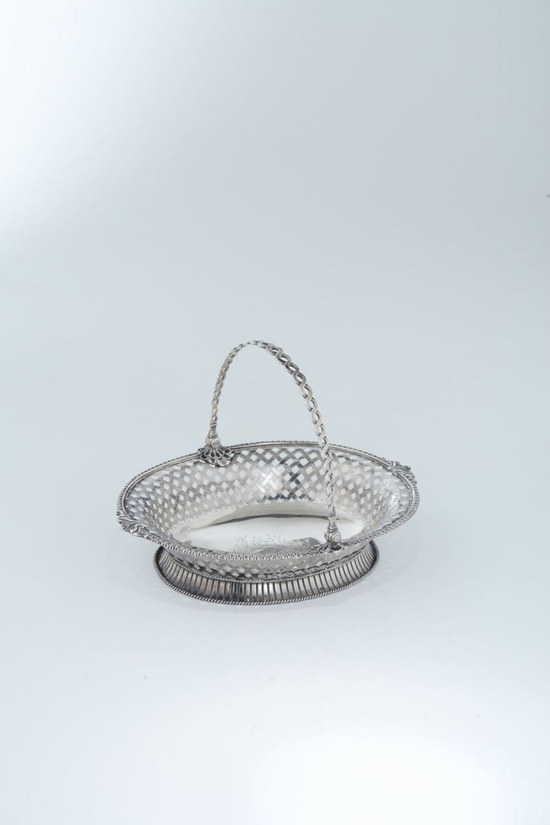 Cestino ovale con manico in argento sterling fuso, sbalzato e cesellato, Inghilterra XVIII secolo, città di Londra 1754-1755, [..]