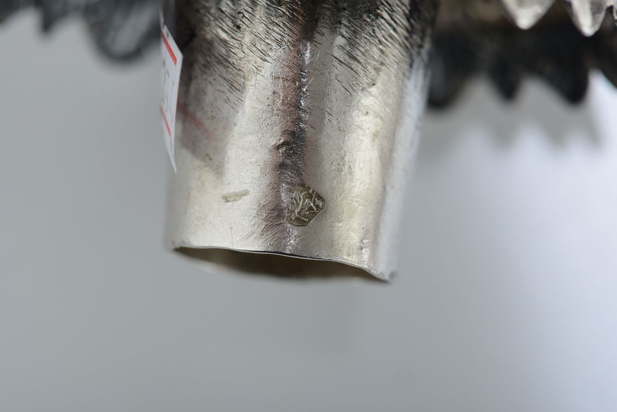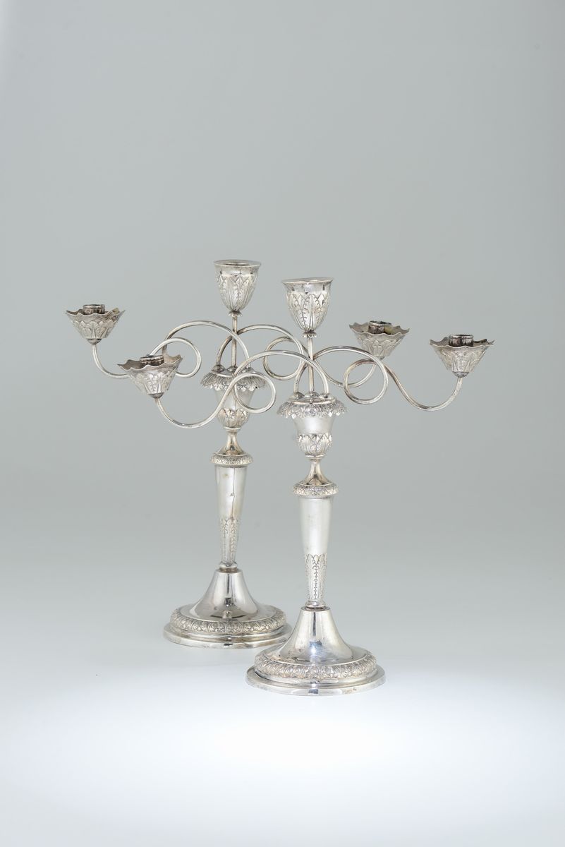 Coppia di candelabri a tre fiamme in argento sbalzato e cesellato, Genova XIX secolo, punzoni croce mauriziana, delfino e dell’argentiere in uso dal 1825 al 1875