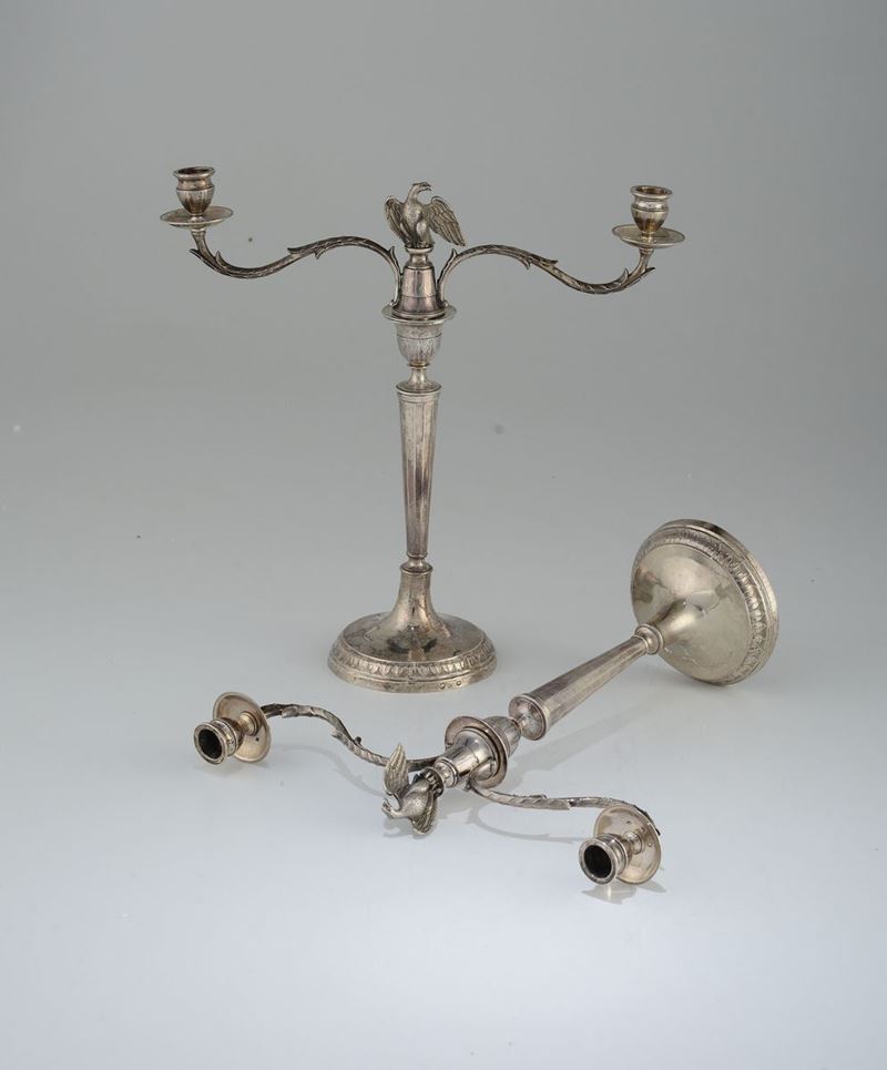 base circolare e fusto troncoconico sfaccettato decorati con foglie lanceolate terminante con due bracci sagomati recanti al centro una figura di aquila imperiale.gr. 1775, altezza cm 38