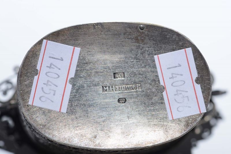 una di forma ovale con coperchio riccamente lavorato con motivi a fiori ed una con coperchio a sarcofago e presa a fiore corpo bombato poggiante su quattro piedini sferici in filigrana lavorata a piume.gr, 70 cm 8,5x4,8x6 e gr. 80 cm 6,8x5x5,4