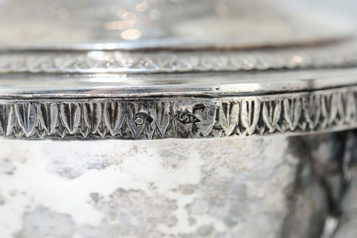 Grande zuccheriera in argento fuso, sbalzato e cesellato, Roma prima metà del XIX secolo, argentiere Angelo Giannotti (1824-1865)