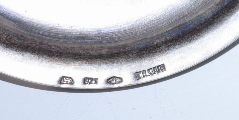 Gruppo di sei piattini in argento fuso e cesellato, Italia XX secolo, punzone con fascio littorio in uso dal 1934 al 1944, argentieri F.lli Leone Milano per Bulgari