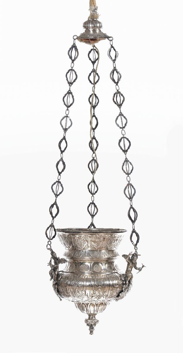 agli angoli tre puttini in argento fusi a cera persa, catena con finale a presa.gr. 1100 circa, diametro cm 13, altezza cm 24,5, con catena cm 72