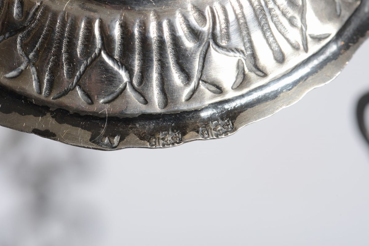 Lampada pensile in lastra d’argento sbalzata, Napoli punzone corporativo di città, 1740, punzone di maestro argentiere