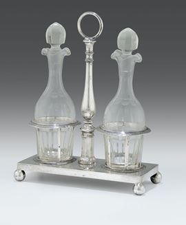Oliera in argento sbalzato e cesellato ed ampolle in vetro, Napoli XIX secolo, punzoni in uso dal 1832 al 1872
