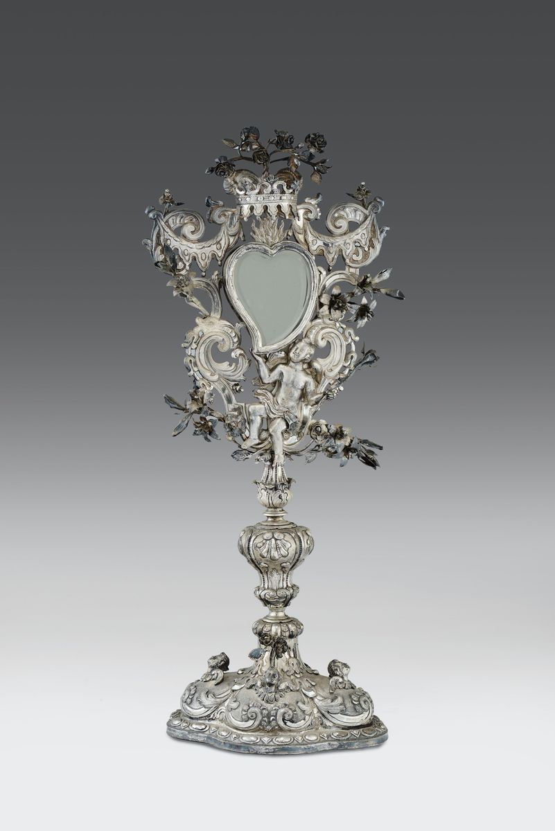 piede polilobato con testine di cherubini aggettanti sui lati e fusto a rocchetto da cui diparte una teca a foggia dicuore con un profilo di angelo alato che la sorregge, contorno composto da un ornato floreale di gigli e rose mariane.gr. 1270, altezza cm 48