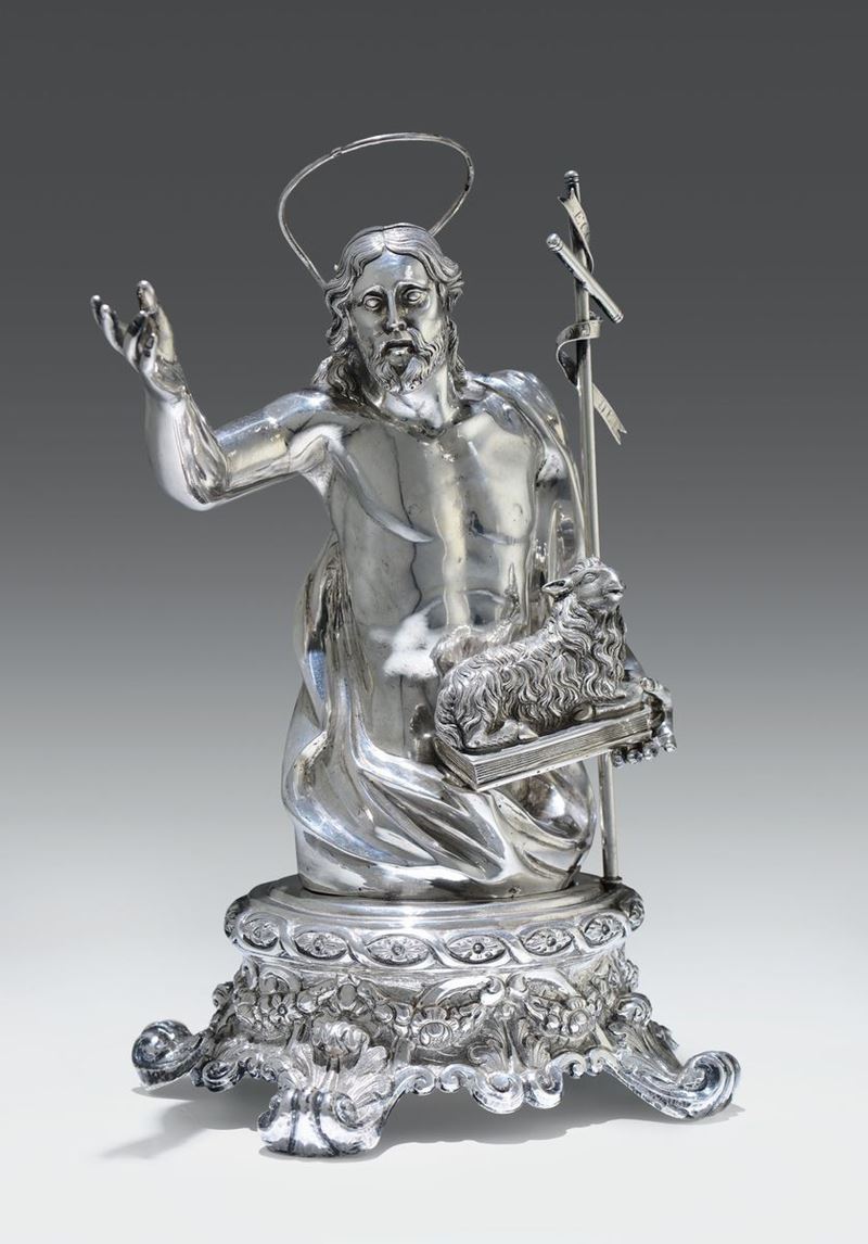 importante busto di San Giovanni Battista raffigurato benedicente con gli attributi dell'Agnus Dei e della croce con la scritta Ecce Agnus Dei. Ricca base ovale con quattro piedi a ricciolo, sbalzata e cesellata con motivi a girali, festoni e volute.gr. 1480, altezza cm 30