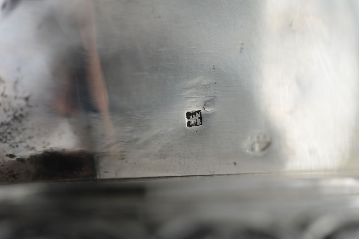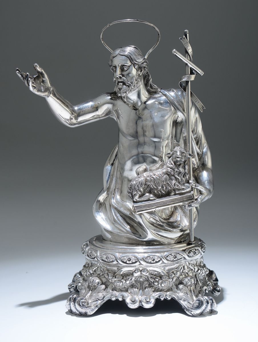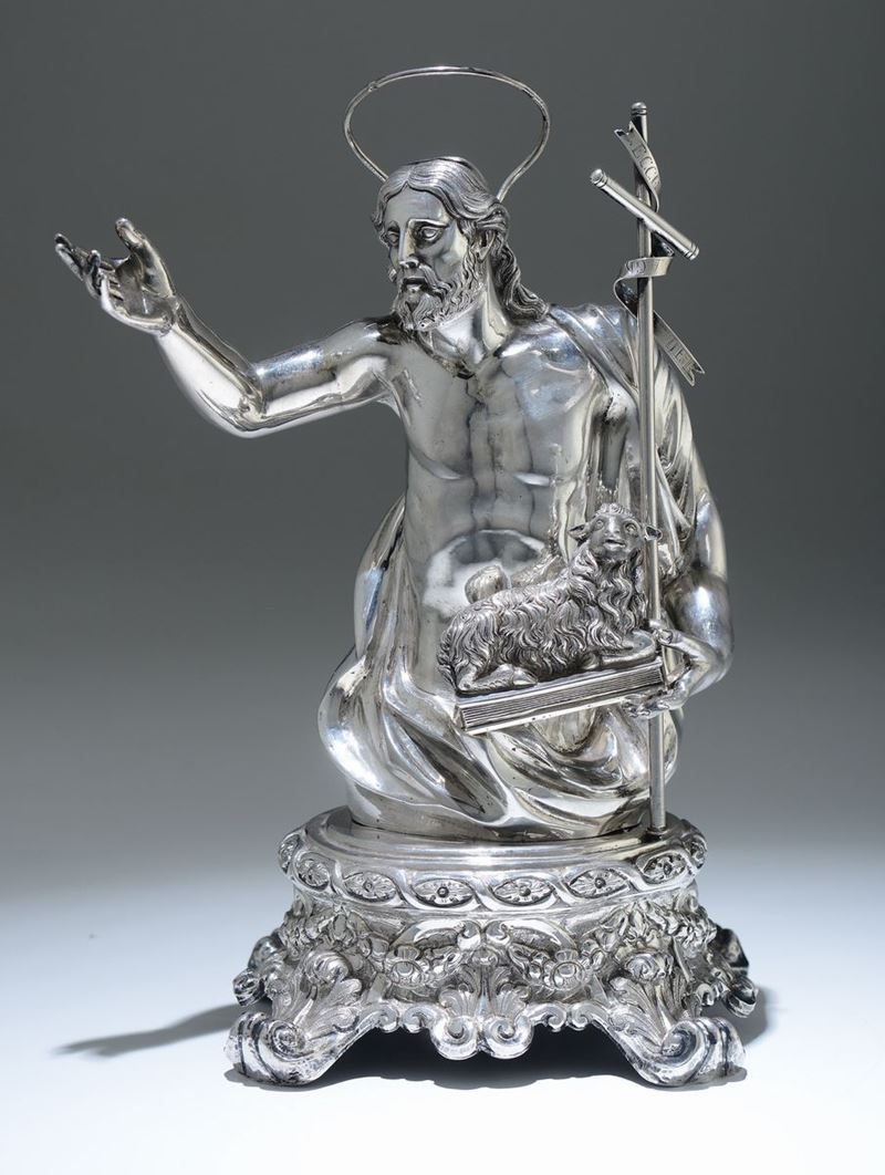 Scultura raffigurante San Giovanni Battista in argento fuso, sbalzato e cesellato, Napoli XIX secolo, punzone di titolo in uso dal 1832 al 1872 e dell'argentiere Salvatore Preti
