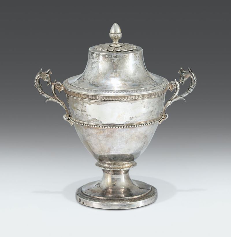 corpo a vaso decorato con motivi a perlinature e palmette, anse laterali a foggia di teste equine e presa del coperchio a pigna.gr. 470, altezza cm 19