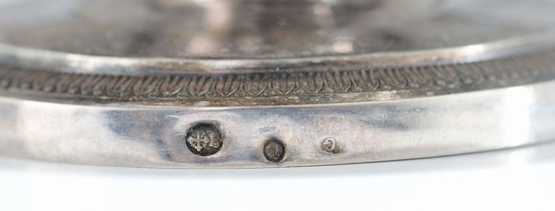 Zuccheriera in argento fuso, sbalzato e cesellato, Genova metà del XIX secolo, punzoni con croce mauriziana e delfino in uso dal 1825 al 1872